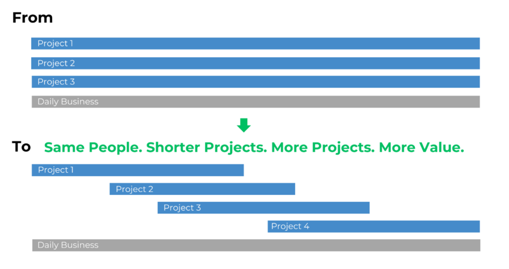 Once this cycle takes hold, it drains organizations of momentum, energy, and success. Our experience shows: Project switching, waiting for or competing over resources, top management escalations, and micromanagement can consume 30% or more of productive time.